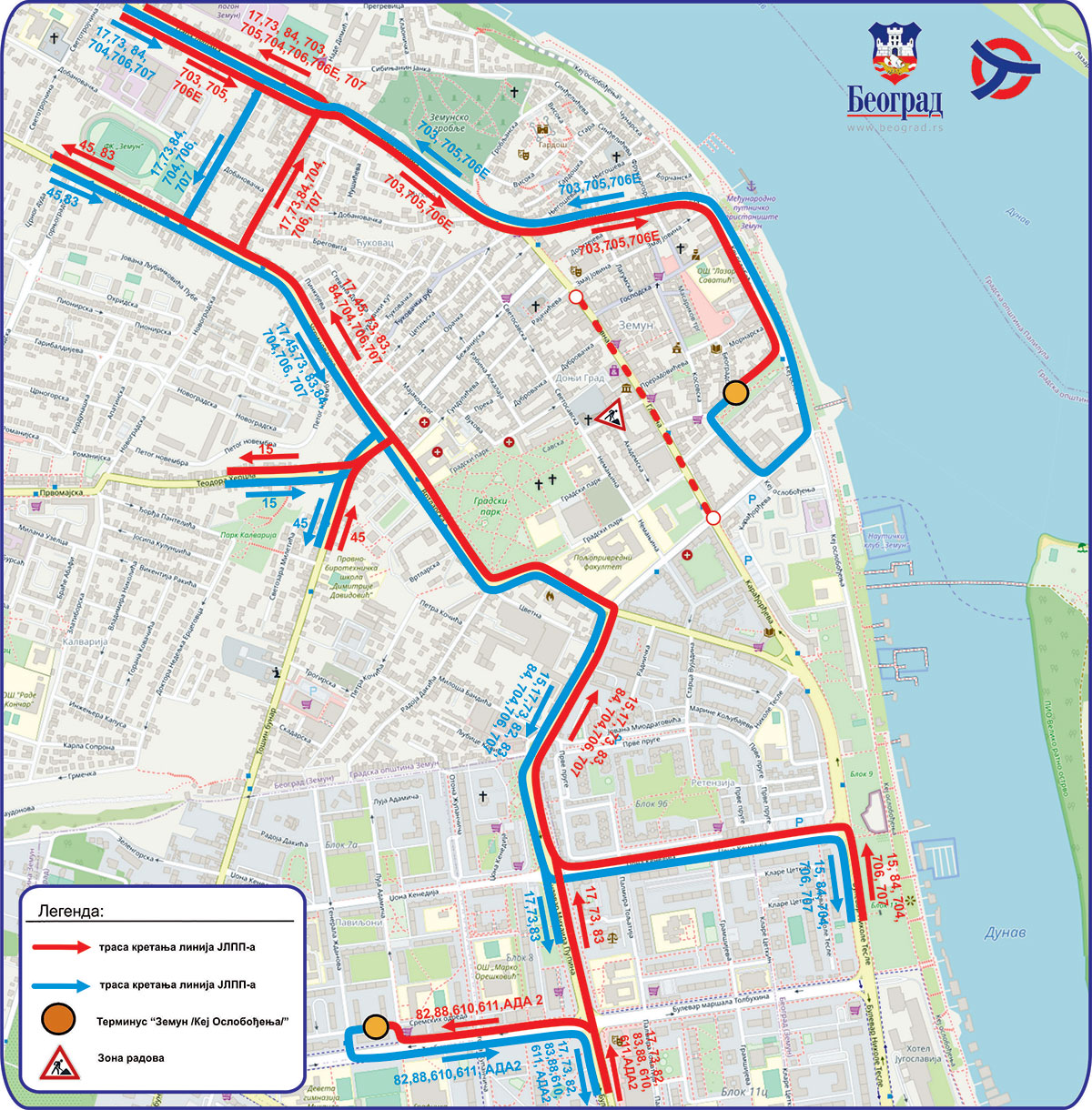 Tokom izvođenja radova na rekonstrukciji Glavne ulice, na delu od zone raskrsnice sa Avijatičarskim trgom (raskrsnica je zatvorena za saobraćaj) do Zmaj Jovine ulice u Zemunu, menja se režim rada linija javnog prevoza.