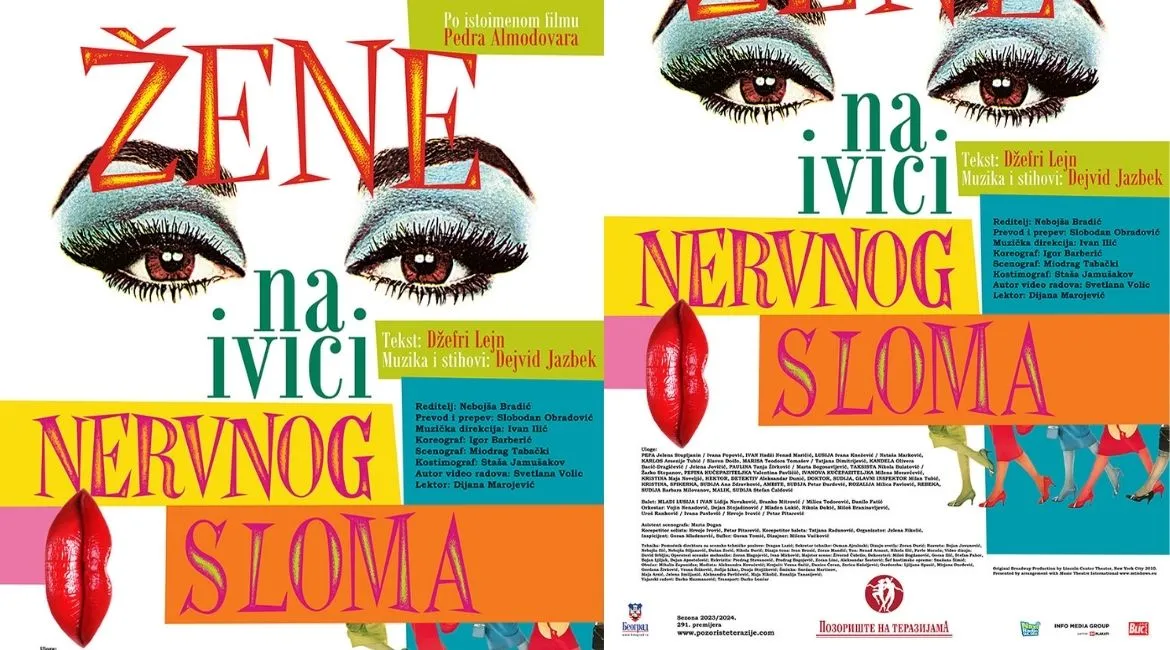 Predstava Žene na ivici nervnog sloma je rađena prema filmu. Film “Žene na ivici nervnog sloma” je španska crna komedija iz 1988. godine, prema scenariju i režiji Pedra Almodovara. Iste te godine, film je bio nominovan za Oskara u kategoriji za najbolji film na stranom jeziku, a debitovao je i na 45. filmskom festivalu u Veneciji. Osvojio je pet “Goja” nagrada (Španski Oskar), koje dodeljuje španska Akademija filmske umetnosti i nauke, i dva priznanja od Evropske filmske akademije. Bio je takođe nominovan i za nagrade BAFTA i Zlatni globus.