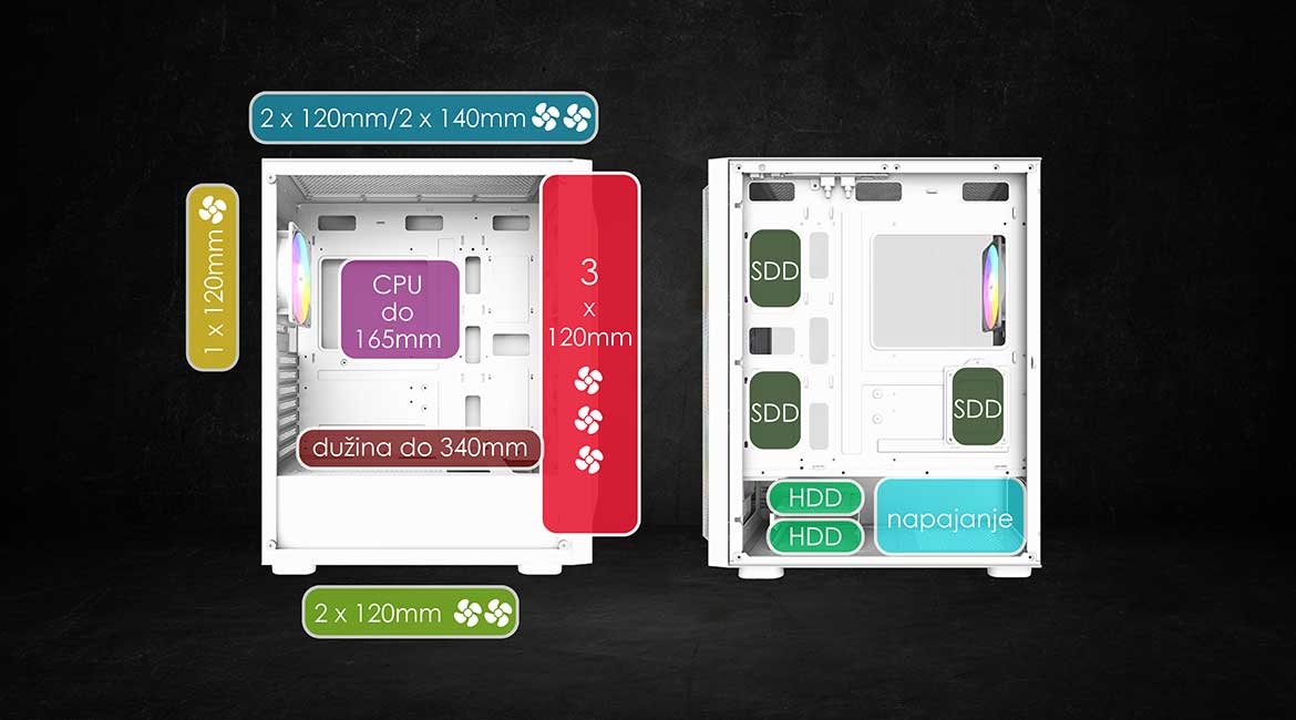 Ovaj model se izdvaja snažnim protokom vazduha, fabrički instaliranim ARGB ventilatorima i podrškom za ozbiljne komponente.