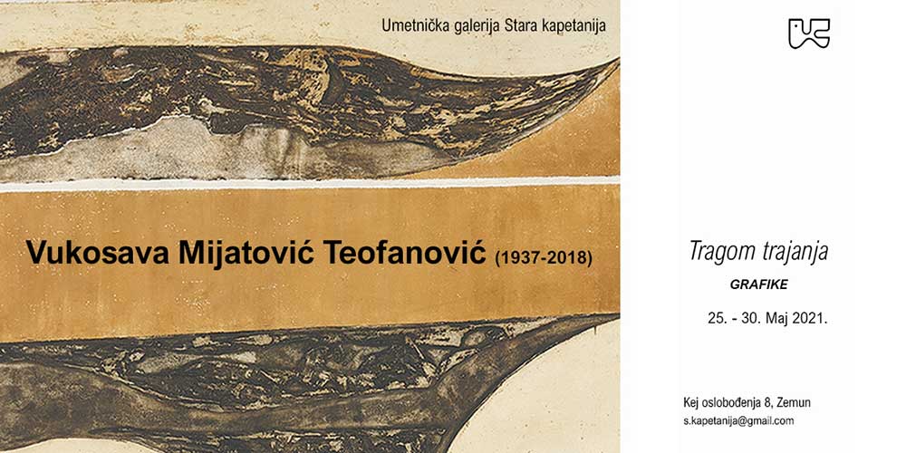 U Umetničkoj Galeriji ”Stara Kapetanija” na zemunskom keju od 25. do 30. maja, biće izloženo 20 autorskih otisaka u tehnici akvatinte priznate srpske grafičarke Vukosave Mijatović Teofanović (1937-2018).